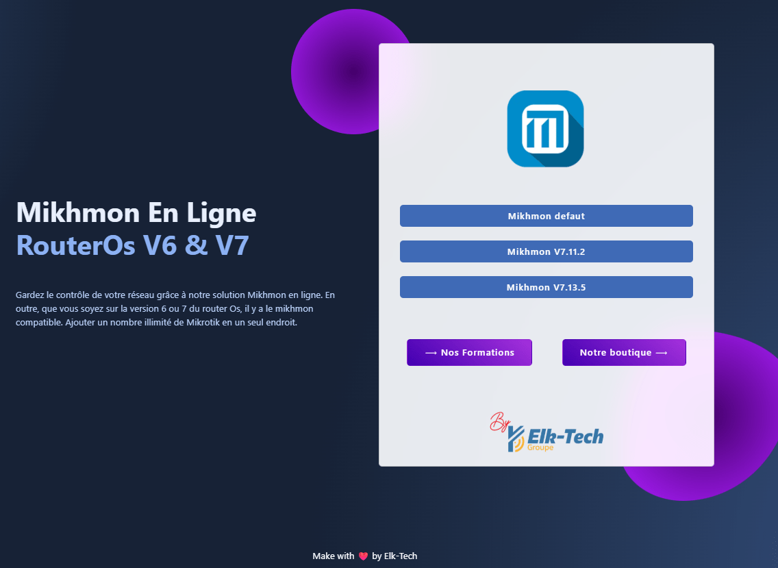 Gardez le contrôle de votre réseau grâce à notre solution Mikhmon en ligne. En outre, que vous soyez sur la version 6 ou 7 du router Os, il y a le mikhmon compatible. Ajouter un nombre illimité de Mikrotik en un seul endroit.