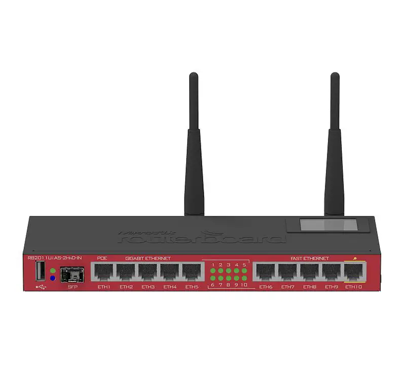 Le MikroTik RB2011UiAS-2HnD-IN est un routeur multifonction abordable, conçu pour les environnements domestiques et professionnels. Il offre une connectivité étendue avec 10 ports Ethernet (5 ports Gigabit et 5 ports Fast Ethernet), un port SFP pour les connexions fibre optique, et un point d’accès Wi-Fi 2,4 GHz puissant avec deux antennes omnidirectionnelles de 4 dBi.